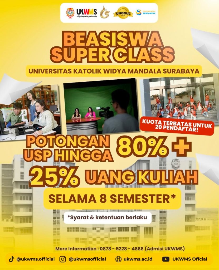 Universitas Katolik Widya Mandala Surabaya (UKWMS) membuka program Beasiswa Super Class bagi calon mahasiswa yang belum lolos jalur SNBP. Program ini menjadi alternatif bagi calon mahasiswa untuk tetap melanjutkan studi di UKWMS dengan dukungan beasiswa.